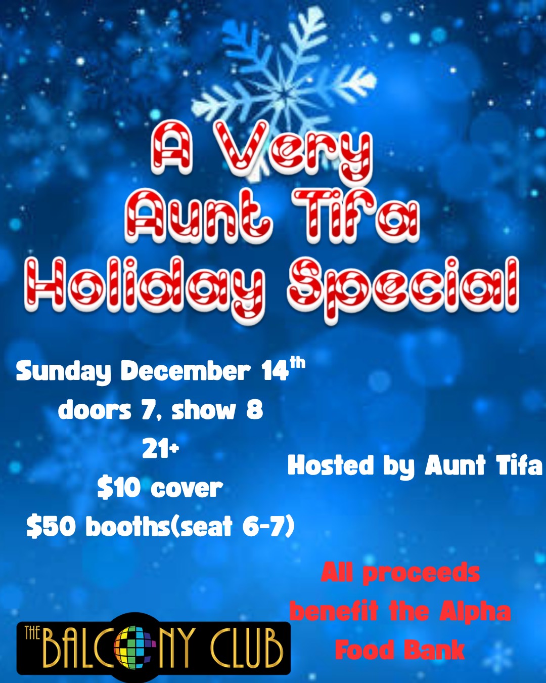 The holidays are a season of giving and community, this holiday season, Aunt Tifa and several awesome local performers are excited to bring you a one of a kind show in order to raise money for the food bank at ALPHA to really give back to the community this season. Come celebrate with some incredible local drag, and burlesque and support our local community. All proceeds from this show will go directly to the food bank at ALPHA.
