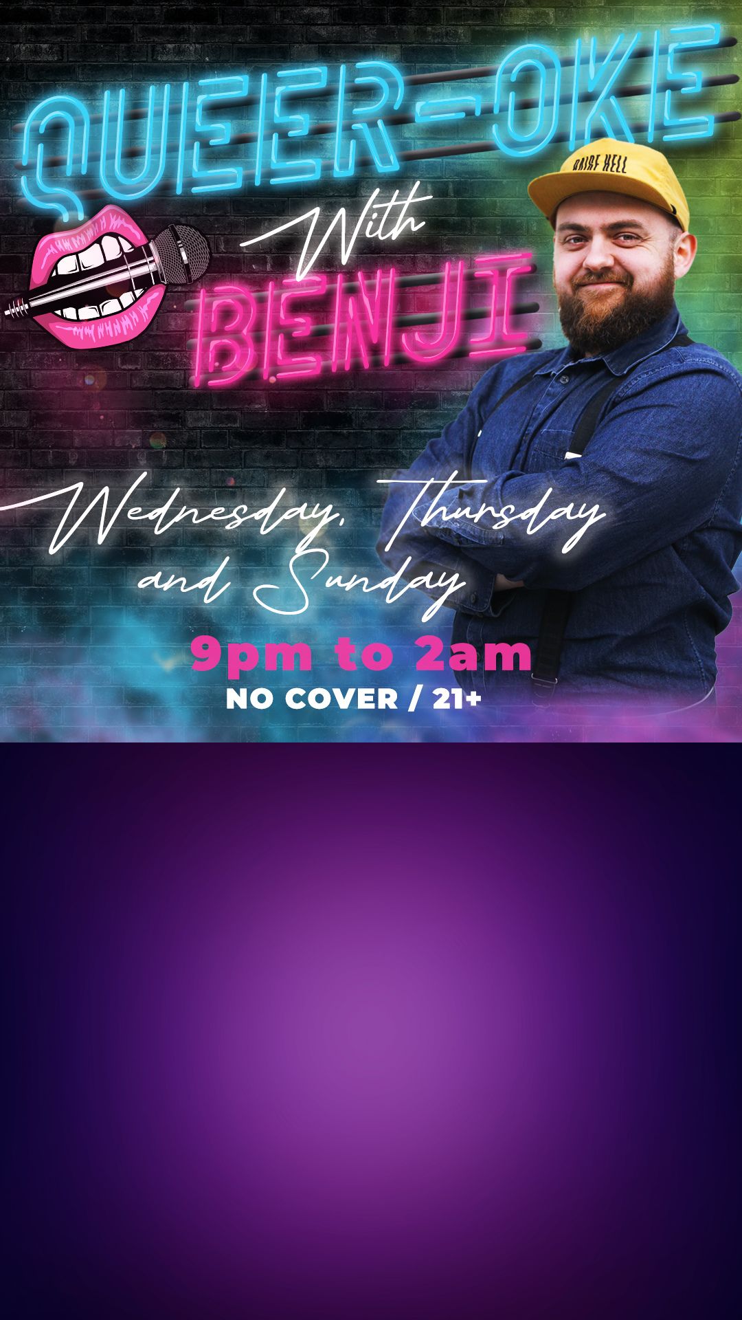 Wanna fun and free time to hang out with your friends? Come be the star for Queer-oke on Wednesday, Thursday, & Sunday nights from 9:30pm-2:00am with our amazing KJ, Benji!