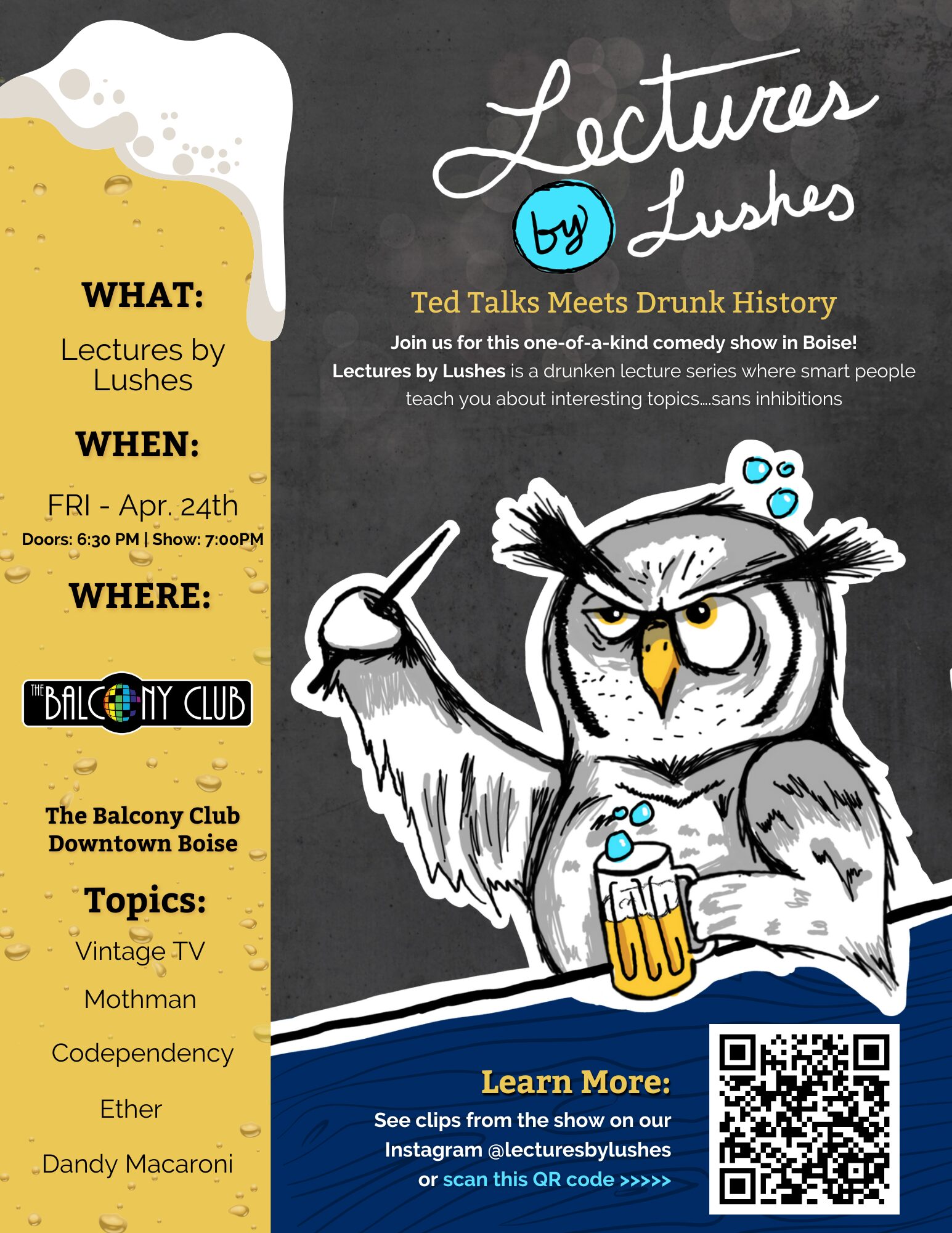 Join us at The Balcony Club for one-of-a-kind comedy show! Lectures by Lushes is Ted Talks meets Drunk History – come see smart people teach you about interesting topics while completely hammered!