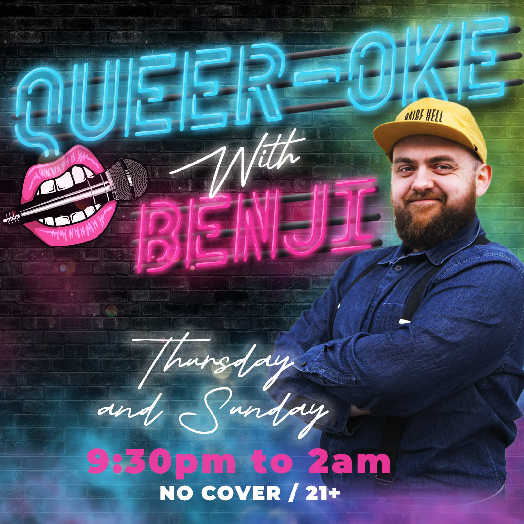 Wanna fun and free time to hang out with your friends? Come be the star for Queer-oke on Thursday & Sunday nights from 9:30pm-2:00am with our amazing KJ, Benji!