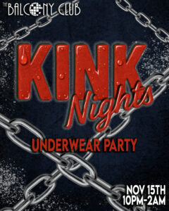 November Kink Night is here and its time to dress down and heat things up! Saturday, come show off your favorite undies and dance the night away! 10pm – 2am